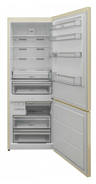 Благодаря классу энергоэффективности А+ модель потребляет всего 409 кВт*ч электроэнергии в год при мощности подключения 177 Вт. Есть две лампы освещения основной камеры и звуковой сигнал при долгом открытии двери. Уровень звукового давления — 43 дБ. В морозильной камере используется система No Frost. За управление отвечают электронные кнопки с цифровым дисплеем.