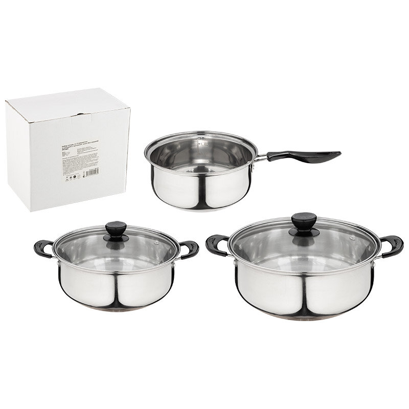 Толщина стенок 0,3 мм, объемы: 1,25 л кастрюля, 2,2 л кастрюля, 1,25 л ковш. Размеры: 17,5*7,5 см/21,5*8,5см/17,5*7,5 см. (Диаметр*высота без крышки). Размеры с ручками: 30,7/24,3/28,4 см. Высоты крышек с ручками: 7,8/12,0/12,6 см.