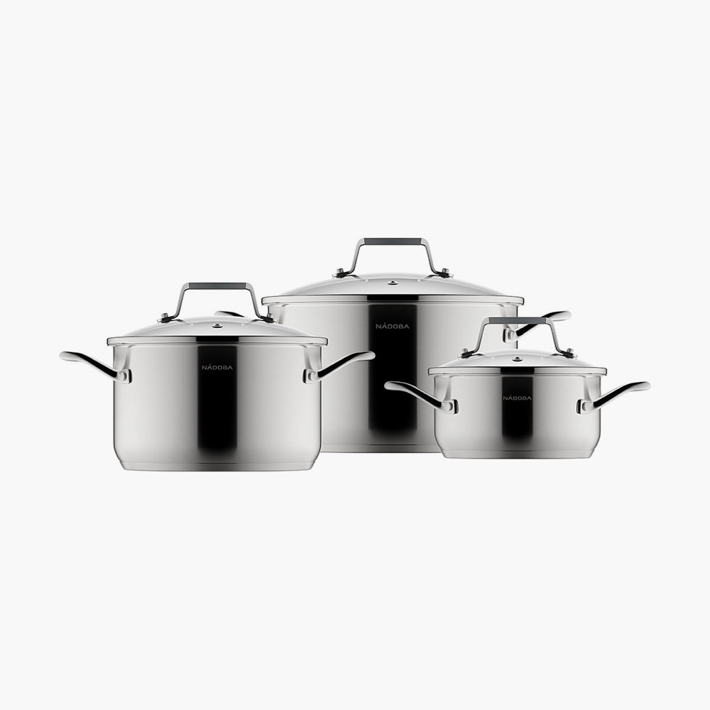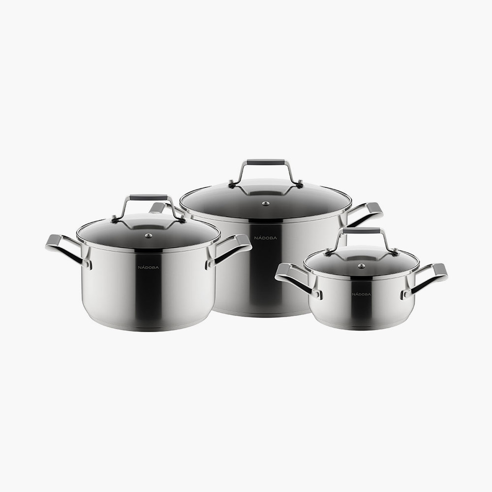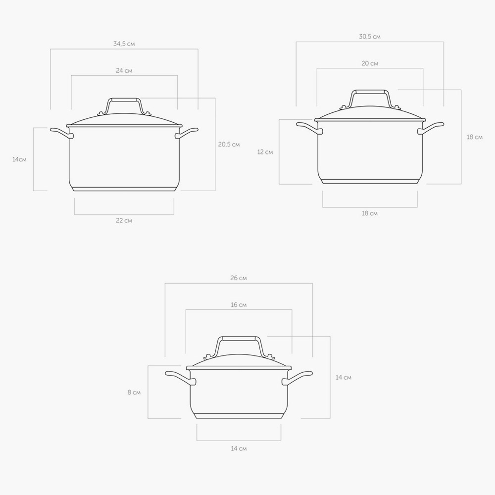 Состав набора: Кастрюля со стеклянной крышкой 6 л/24 см; Кастрюля со стеклянной крышкой 3,4 л/20см; Кастрюля со стеклянной крышкой 1,4 л/16см