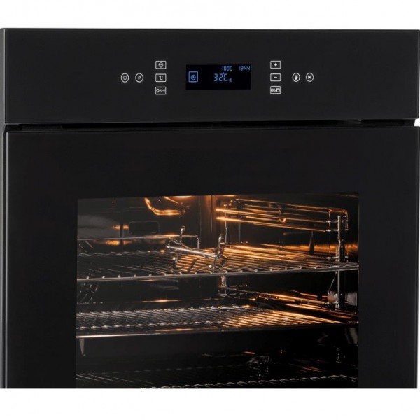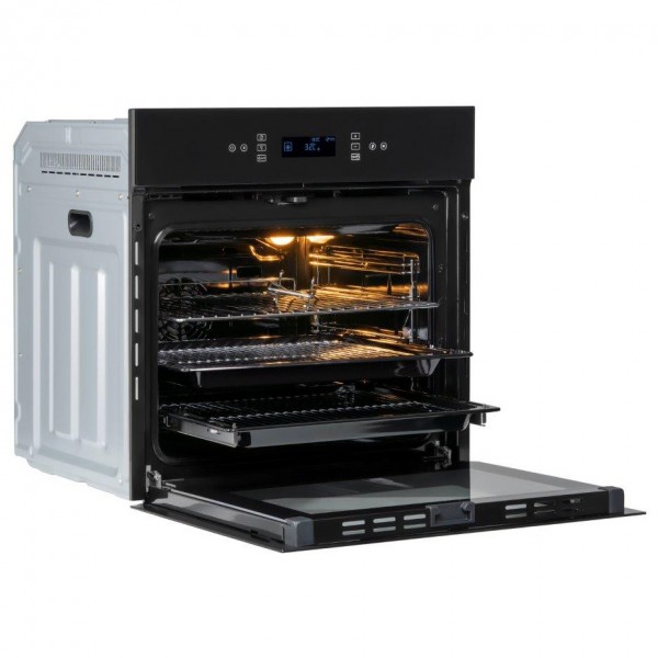 Данная модель духового шкафа относится к встраиваемому типу техники, что позволяет оформить кухонный интерьер компактно, стильно и функционально. Объемные размеры духовой камеры предназначены для приготовления блюд на большую семью. Благодаря наличию 5 уровней готовить можно несколько блюд одновременно. Дверца имеет три стекла, обеспечивающих безопасность для пользователя: при работе внешняя часть остается холодной и минимизирует риск обжечься – холодный фронт. Также стёкла можно легко снять, чтобы упростить процесс поддержания техники в чистоте. Материал внутренней части духовой камеры сделан из эмали легкой очистки без пор, в которых могли бы застрять капли жира или остатки пищи. Отличительной чертой данной модели является отсутствие ручки