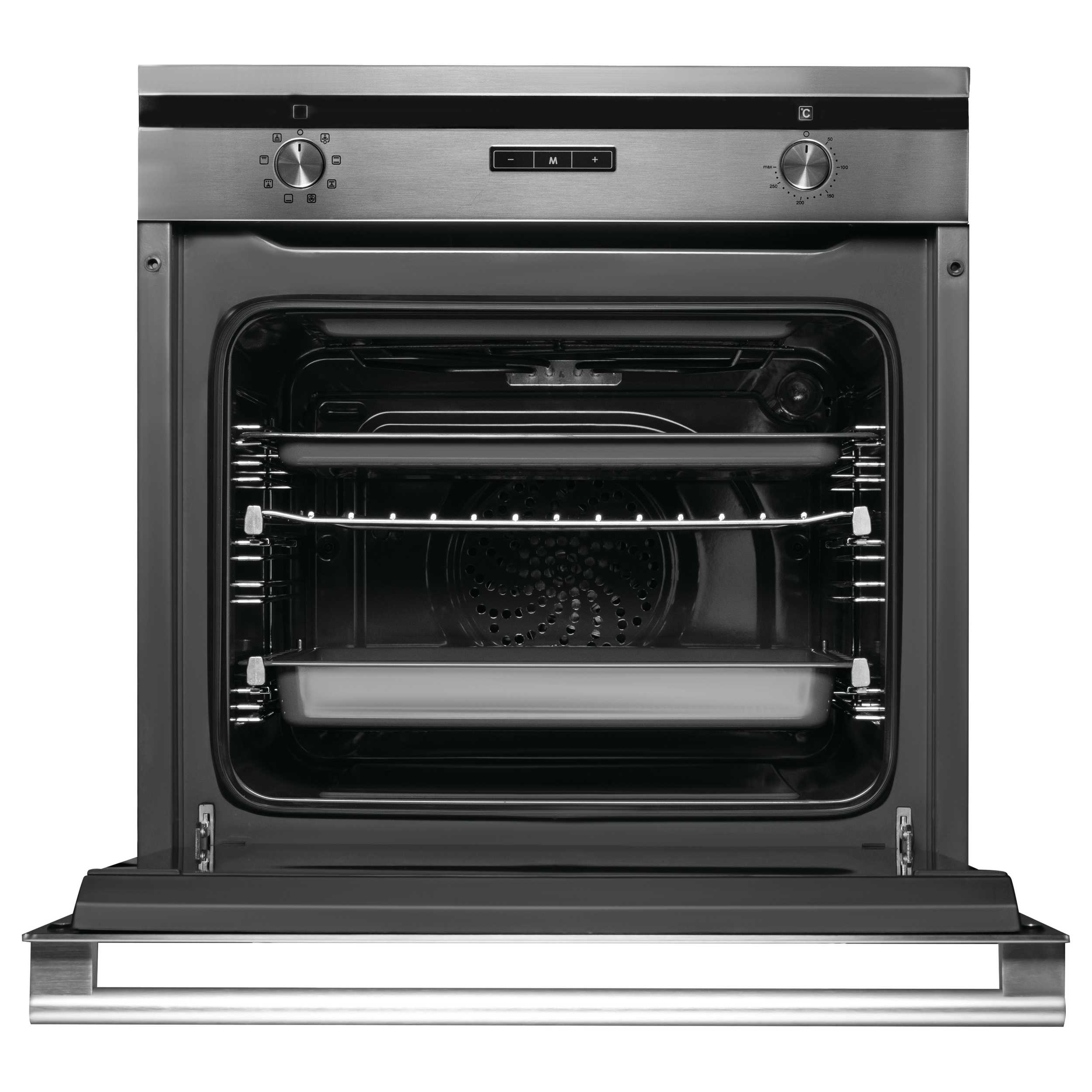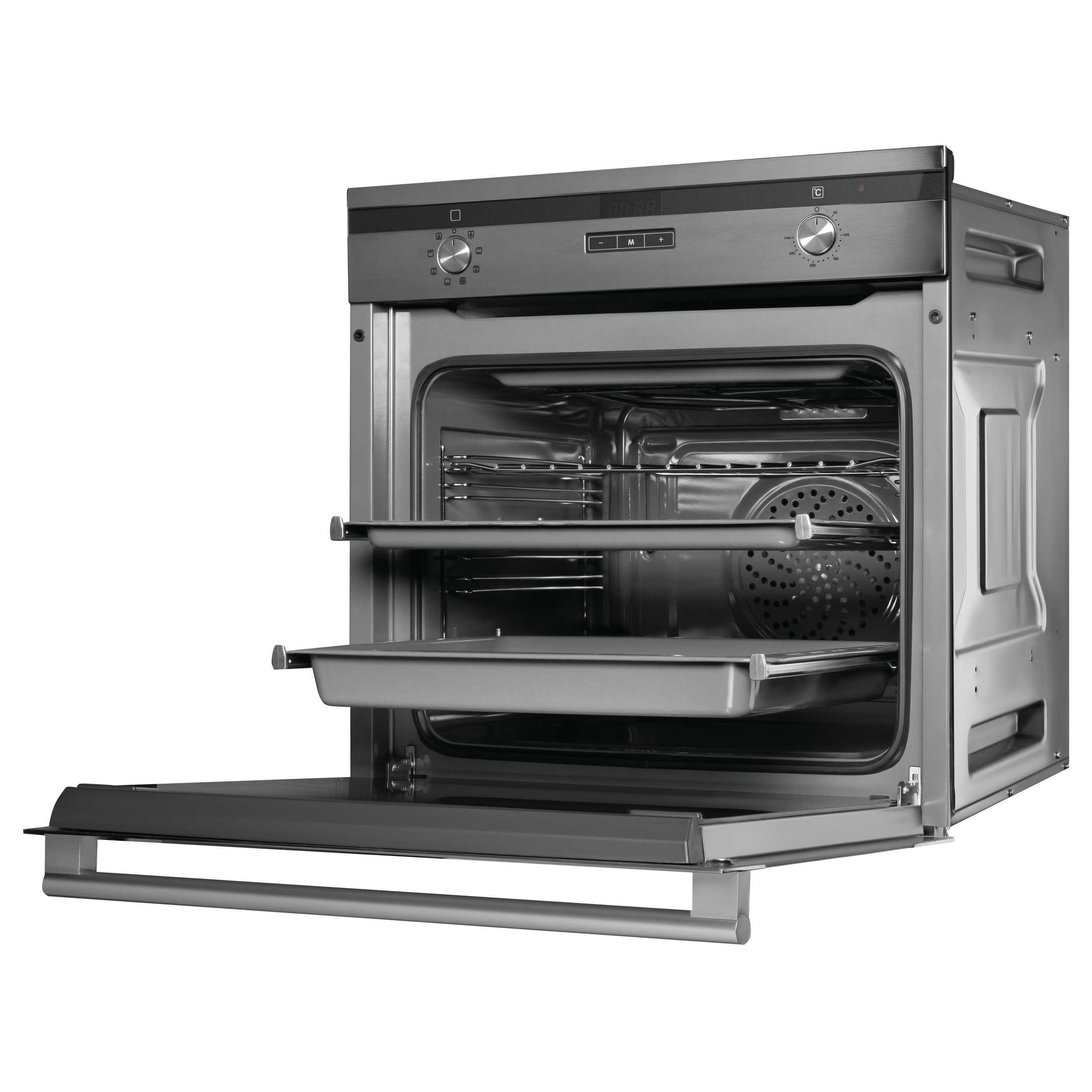 Конвекционный нагрев обеспечивает распределение горячего воздуха в рабочей камере, что гарантирует равномерное пропекание и уменьшает время приготовления. Наличие девяти видов нагрева дает возможность выбрать оптимальный режим для любого блюда. Имеются специальные программы, такие как малый и объемный гриль, конвекционное размораживание. В панель управления духовкой входят поворотные и сенсорные переключатели.