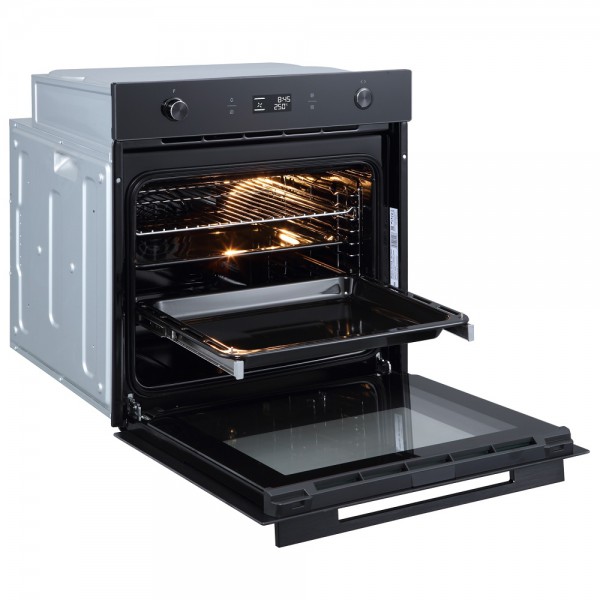 Дверца имеет три стекла, обеспечивающих безопасность для пользователя. Также стёкла можно легко снять для очистки. Материал внутренней части духовой камеры сделан из эмали легкой очистки без пор. Тангенциальное охлаждение осуществляет встроенный мощный вентилятор, который создает воздушный барьер вокруг духовки и сохраняет кухонный гарнитур в безопасности от высоких температур внутри камеры духового шкафа. Доводчик на дверце духовки заботится о тихом и аккуратном пользовании. Управление с помощью утапливаемых переключателей в сочетании с электронным программатором и сенсорной настройкой времени. Благодаря индикаторам на дисплее легко контролировать процесс приготовления. При открытии дверцы в камере духового шкафа автоматически загорится свет для удобной загрузке блюда. В комплекте есть решетка и два противня: плоский и глубокий.