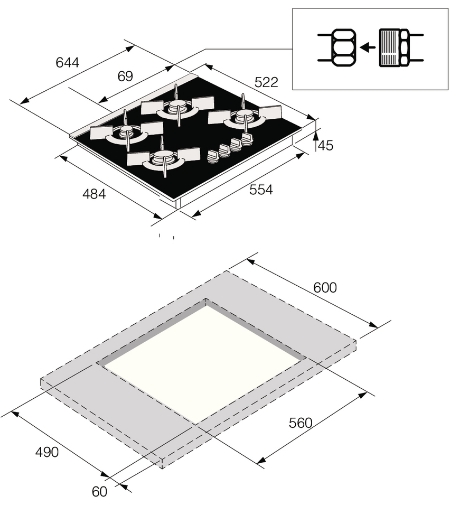 Предусмотрена система газ-контроль. Эта функция автоматически прекращает подачу газа к горелкам, если пламя гаснет из-за случайного воздействия. Система газ-контроля работает просто: в каждой горелке установлен специальный датчик, который реагирует на наличие пламени. Если огонь гаснет, он остывает и передает сигнал на клапан, который перекрывает подачу газа. Таким образом, исключается возможность утечки газа и возникновения опасных ситуаций, связанных с его использованием. Также варочная панель оборудована электроподжигом — огонь появляется, стоит только особым образом надавить на переключатель.