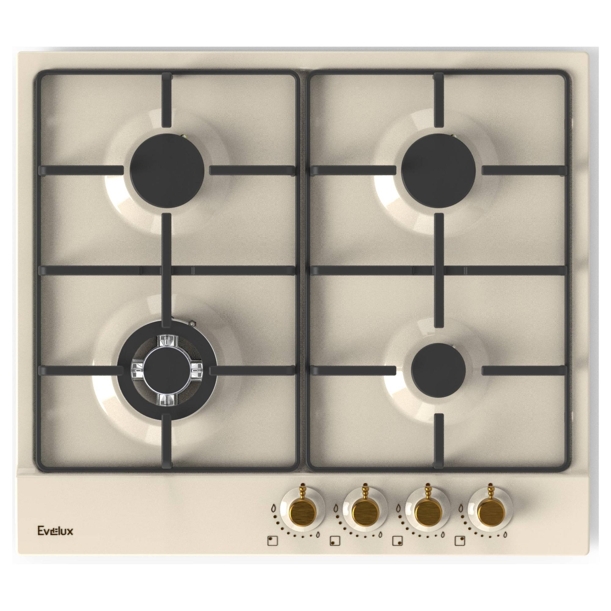 • Металлические поворотные регуляторыПоворотные регуляторы газовых варочных поверхностей Evelux выполнены из металла, что создает профессиональный стиль и препятствует их перегреву.